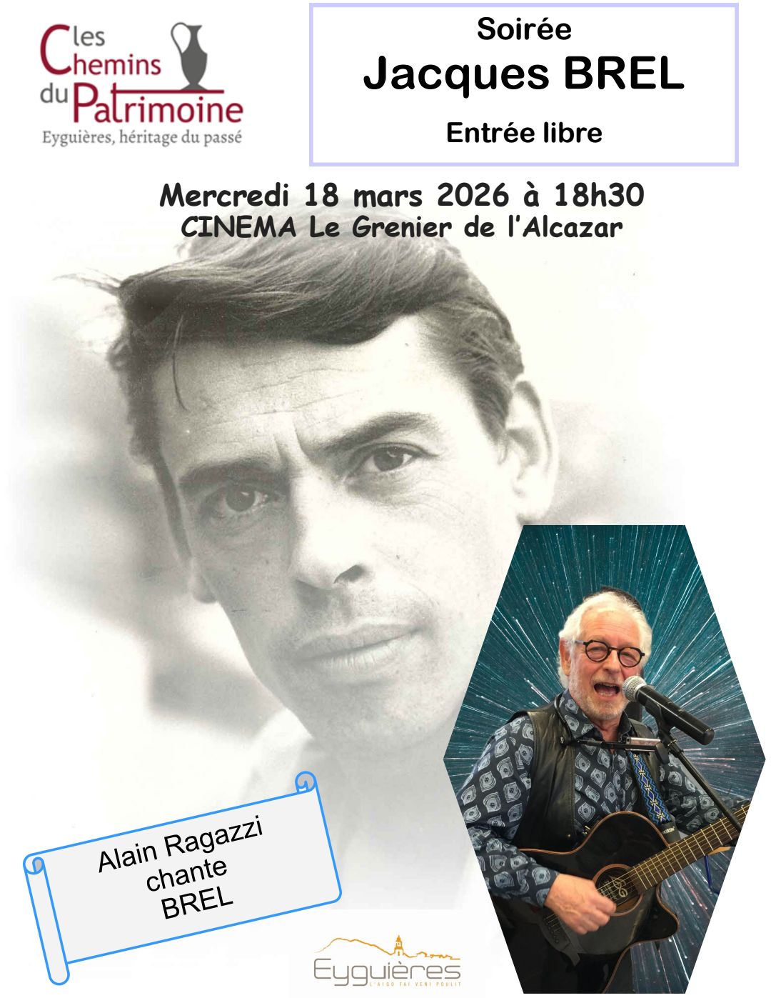 👉 Les Chemins du Patrimoine vous convies à une soirée consacrée à « Jacques Brel », interprétée par Alain Ragazzi.