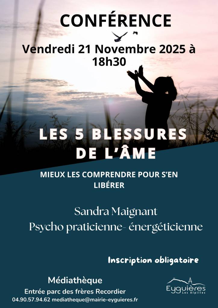 👉 La Médiathèque d’Eyguières vous invite à une conférence sur les 5 blessures de l’âme, animée par Sandra Maignant, psycho patricienne – énergéticienne.