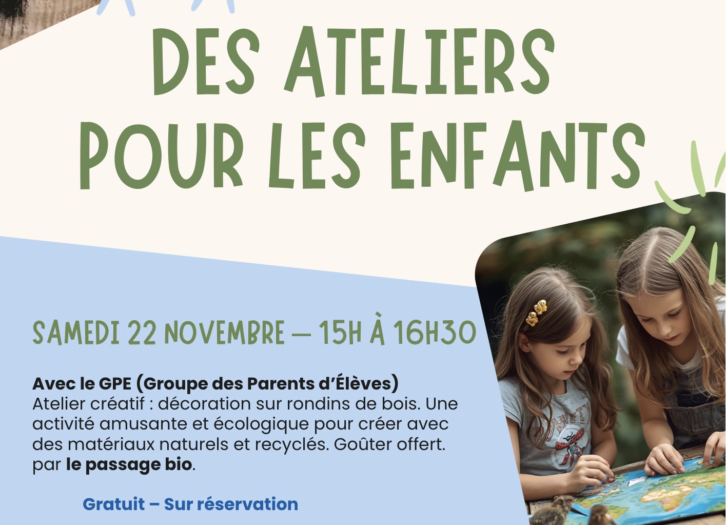 Au programme : Ateliers créatif (décoration sur rondins de bois) et goûter offert par le passage bio ! 🌿