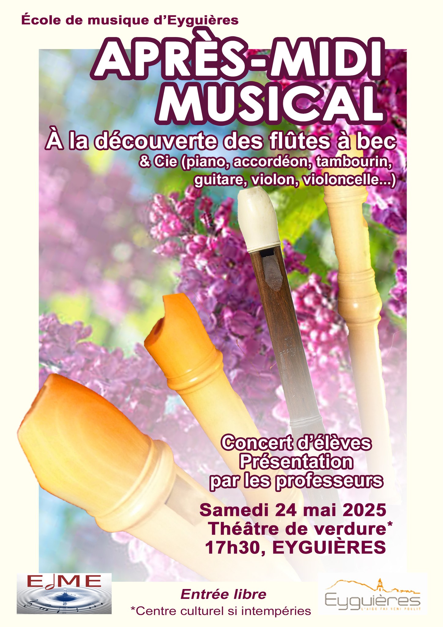 🎶 L’école de musique d’Eyguières vous convie à son concert « À la découverte des flûtes à bec »… mais attention, le programme réserve bien plus ! Piano, accordéon, galoubet-tambourin, guitare, violon et violoncelle seront également de la partie.