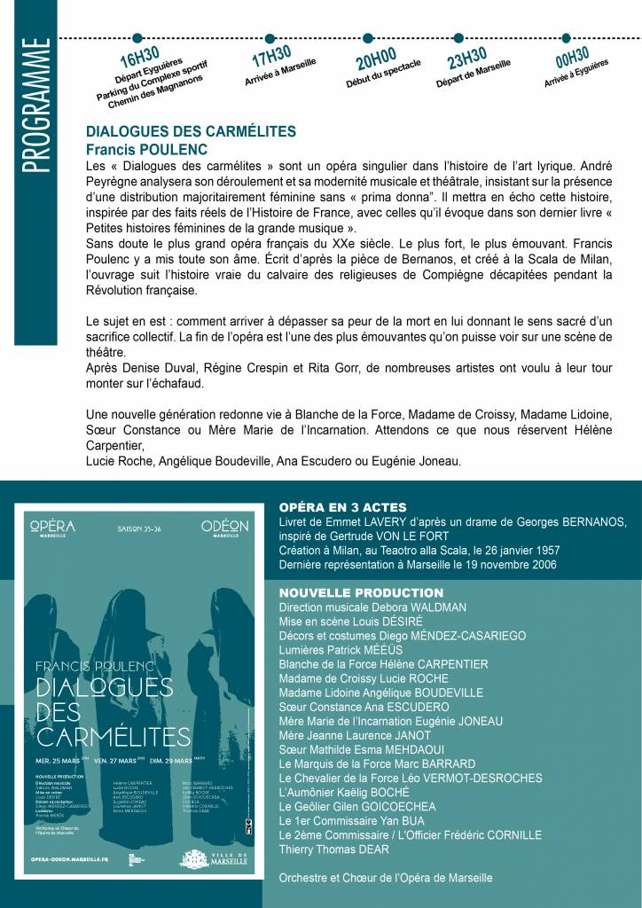 Une sortie culturelle est organisée par la municipalité pour nos séniors à l’Opéra de Marseille pour assister à l’opéra les « Dialogues des carmélites ».