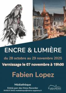 La médiathèque d’Eyguières accueille l’artiste Fabien Lopez pour une exposition haute en contrastes et en émotions ! Entre ombre et clarté, découvrez ses œuvres qui mêlent finesse du trait et profondeur des ambiances 🎨