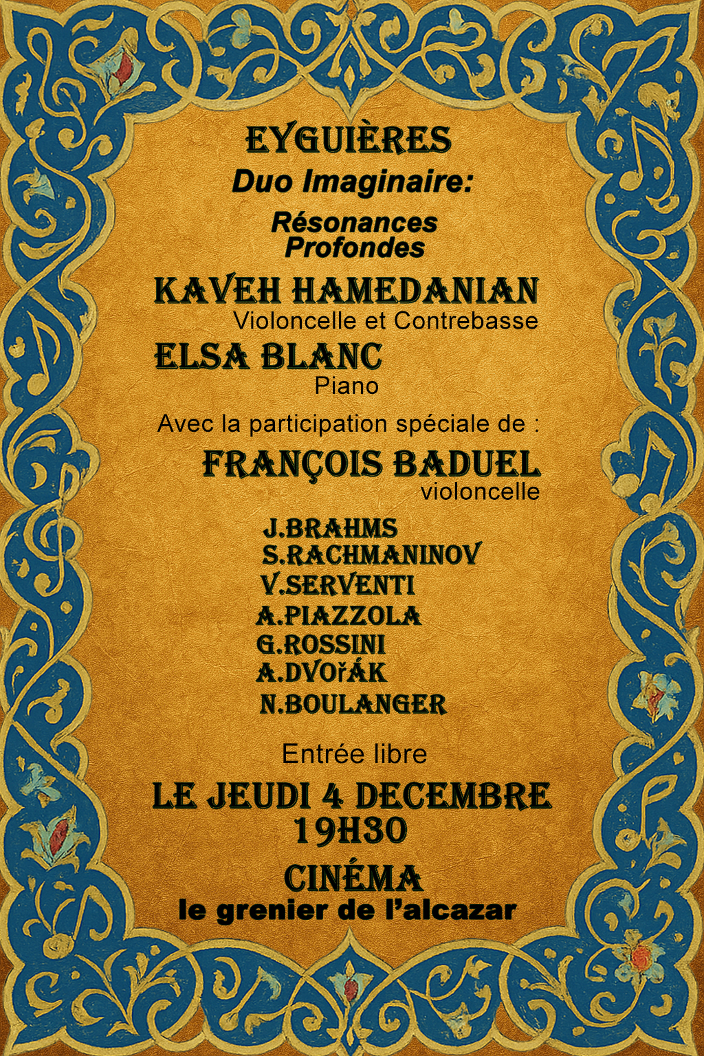 📣 Un moment musical unique vous attend à Eyguières. Violoncelle, contrebasse et piano se rencontrent pour un voyage au cœur des grandes œuvres classiques.