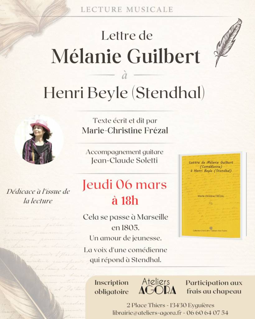 👉 L’Atelier Agora vous invite à une lecture musicale par Marie-Christine Frézal, accompagnée à la guitare par Jean-Claude Soletti.