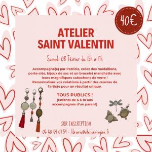 👉 L’Atelier Agora vous propose un atelier spécial Saint-Valentin animé par Patricia. Lors de cet atelier, vous aurez l’opportunité de créer des médaillons, porte-clés, bijoux de sac et un bracelet manchette.