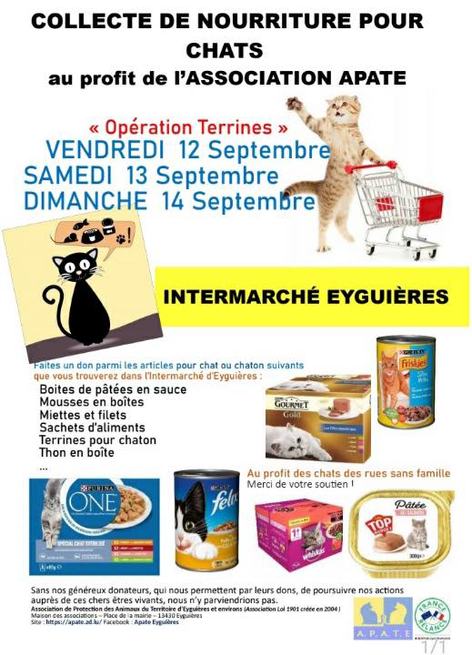 📣 L’association A.P.A.T.E organise sa collecte de rentrée « Opération terrines » au profit de nos amis à quatre pattes 🐱 à 📍 l’𝗜𝗡𝗧𝗘𝗥𝗠𝗔𝗥𝗖𝗛𝗘́ 𝗗’𝗘𝗬𝗚𝗨𝗜𝗘𝗥𝗘𝗦.