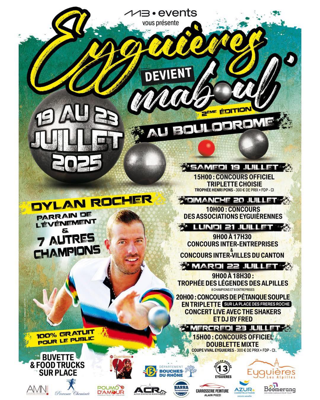 « Tous les Évènements Cet évènement est passé. Du 19 au 23 juillet 2025 Concours de pétanque – Eyguières devient Maboul 19 juillet 2025 à 9h00 - 23 juillet 2025 à 18h00 « 18 juillet 2025 Taureau piscine nocturne – Club Taurin La Bouvine 22 et 24 juillet 2025 Galets Dominos – Médiathèque d’Eyguières » 🪩 [𝗖𝗢𝗡𝗖𝗢𝗨𝗥𝗦 𝗗𝗘 𝗣𝗘́𝗧𝗔𝗡𝗤𝗨𝗘 – 𝗘𝗬𝗚𝗨𝗜𝗘̀𝗥𝗘𝗦 𝗗𝗘𝗩𝗜𝗘𝗡𝗧 𝗠𝗔𝗕𝗢𝗨𝗟] 🪩 📣 113 events vous présente Eyguières Devient Maboul, 2ème édition. Du 19 au 23 juillet 2025 Tous les détails sur l’affiche Ajouter au calendrier Google Agenda iCalendar Outlook 365 Outlook Live Détails Début : 19 juillet 2025 à 9h00 Fin : 23 juillet 2025 à 18h00 Catégories d’Évènement: Évènements de la commune, Local, Sport Lieu Eyguières Eyguieres Eyguieres, France