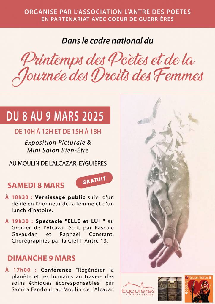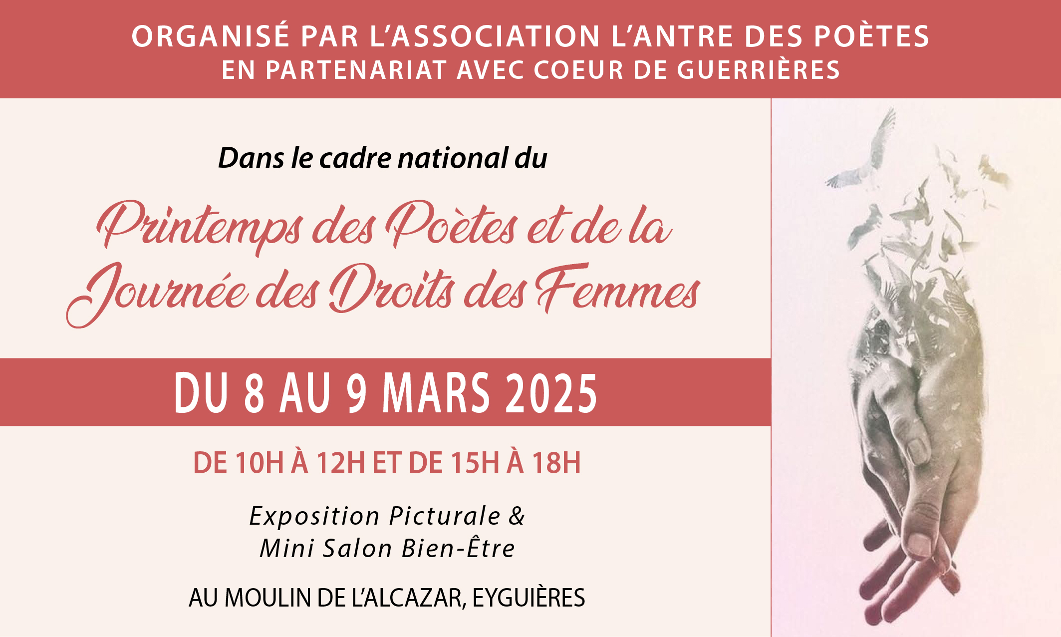 👉 L’association L’Antre des Poètes, en partenariat avec Cœur de Guerrières, organise un événement sur deux jours dans le cadre national du Printemps des Poètes et de la Journée des Droits des Femmes.