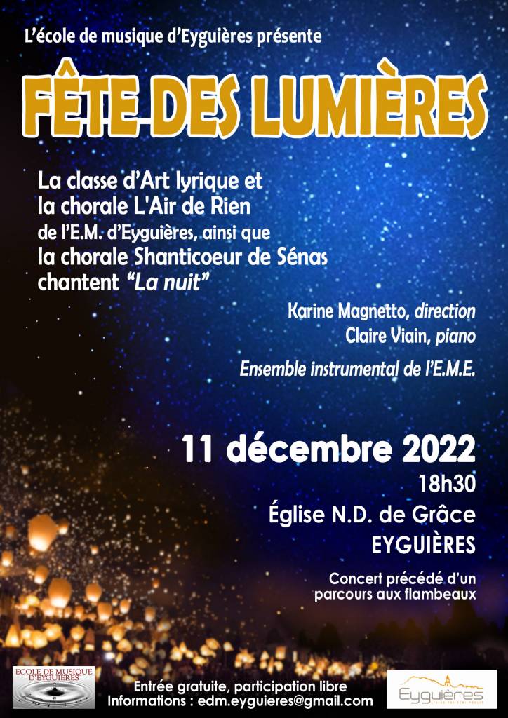 🎤 Les chorales « l’Air de rien » de l’école de musique d’Eyguières et « Shanticœur » de Sénas, la classe d’Art lyrique de l’école de musique et son ensemble instrumental se rencontrent autour du thème de la nuit, sous la direction de Karine Magnetto.