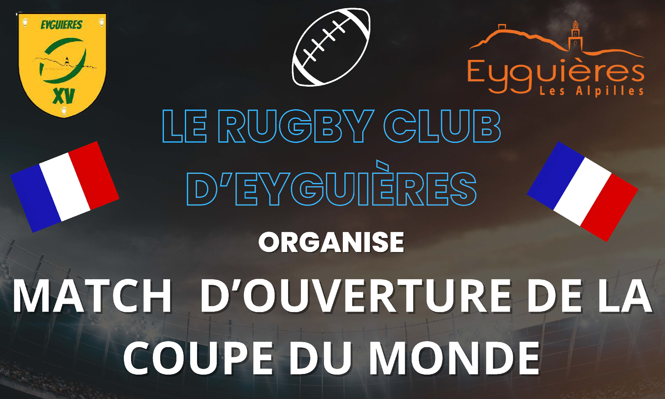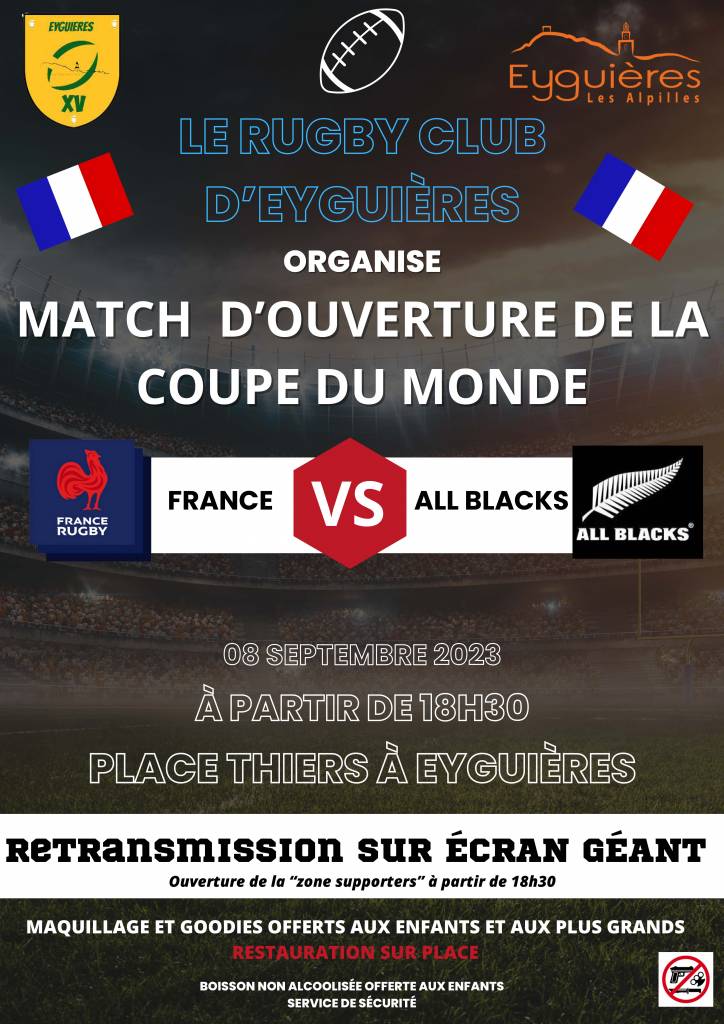 📢 À l’occasion du premier match de la 𝗰𝗼𝘂𝗽𝗲 𝗱𝘂 𝗺𝗼𝗻𝗱𝗲 𝗱𝗲 𝗿𝘂𝗴𝗯𝘆 avec la France qui joue pour l’ouverture contre les All Blacks le Rugby club Eyguieres XV organise une soirée de retransmission en direct sur 𝗘́𝗖𝗥𝗔𝗡 𝗚𝗘́𝗔𝗡𝗧.