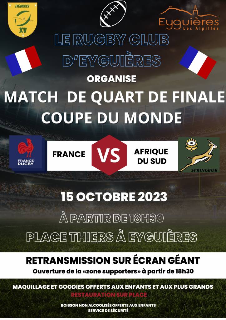 « Tous les Évènements Cet évènement est passé. 15 octobre 2023 MATCH RUGBY – COUPE DU MONDE 1/4 DE FINALE 15 Oct 2023 à 18h30 - 23h30 « 15 octobre 2023 La Guilde Auro – Tournoi Duel commander Necromancia 17 octobre 2023 Thé Dansant – Séniors » 🇫🇷[MATCH RUGBY]🇫🇷 Le Rugby club Eyguieres XV organise un match de quart de finale pour la coupe du monde 🏆 📆 Dimanche 15 octobre 🕝 18h30 📍 Place Thiers à Eyguières 👉 Venez nombreux les soutenir ! 🇫🇷 Ajouter au calendrier Google Agenda iCalendar Outlook 365 Outlook Live Détails Date : 15 Oct 2023 Heure : 18h30 - 23h30 Catégories d’Évènement: Évènements de la commune, Local, Sport Lieu Eyguières Eyguieres Eyguieres, France Organisateur Rugby club Eyguieres XV Voir le site Organisateur