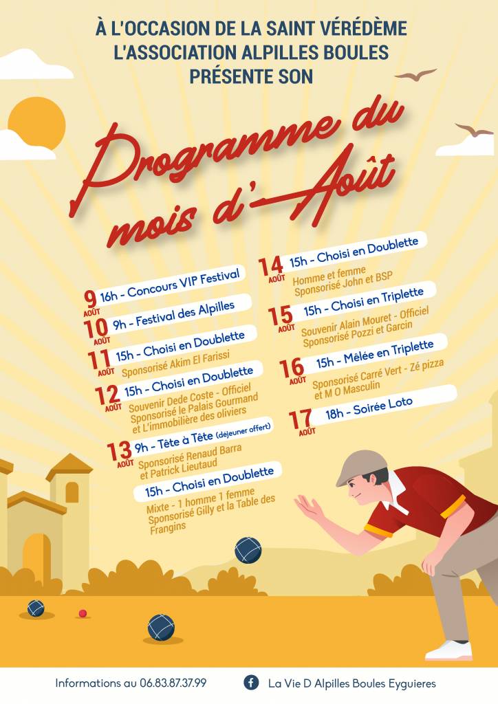 La Vie D Alpilles Boules Eyguieres présente son programme du mois d’Août à l’occasion de la Saint Vérédème