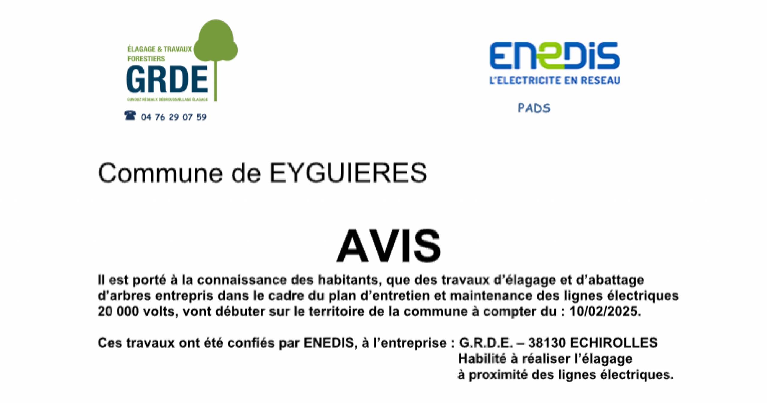 ℹ Nous vous informons que des travaux d’élagage et d’abattage d’arbres vont être réalisés sur la commune dans le cadre du plan d’entretien et de maintenance des lignes électriques, afin d’assurer la sécurité et le bon fonctionnement du réseau.