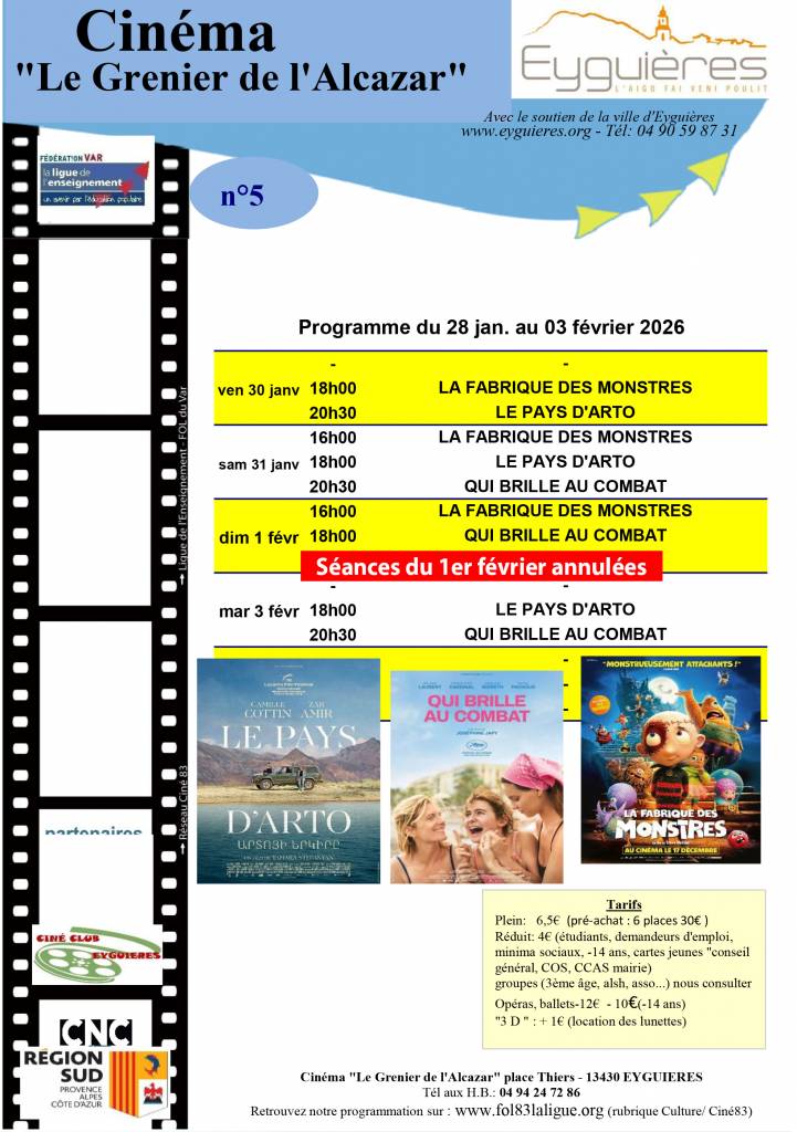 Programme cinéma séances du 28 janvier au 3 février 2026 ‼️𝗟𝗲𝘀 𝘀𝗲́𝗮𝗻𝗰𝗲𝘀 𝗱𝗲 𝗰𝗶𝗻𝗲́𝗺𝗮 𝗽𝗿𝗲́𝘃𝘂𝗲𝘀 𝗹𝗲 𝟭𝗲𝗿 𝗳𝗲́𝘃𝗿𝗶𝗲𝗿 𝗮𝘂 𝗰𝗶𝗻𝗲́𝗺𝗮 𝗟𝗲 𝗚𝗿𝗲𝗻𝗶𝗲𝗿 𝗱𝗲 𝗹’𝗔𝗹𝗰𝗮𝘇𝗮𝗿 𝘀𝗼𝗻𝘁 𝗮𝗻𝗻𝘂𝗹𝗲́𝗲𝘀 Share: