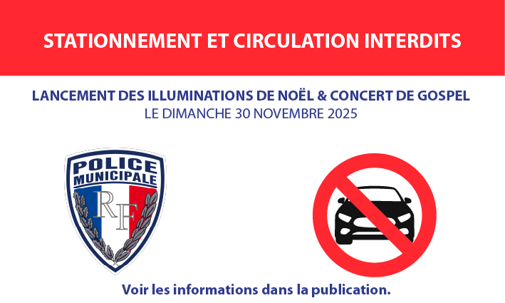 📣 Nous vous informons qu’en raison du lancement des illuminations de Noël et du concert gospel le dimanche 30 novembre, il sera interdit de circuler et de stationner dans les rues du village comme indiqué ci-dessous :